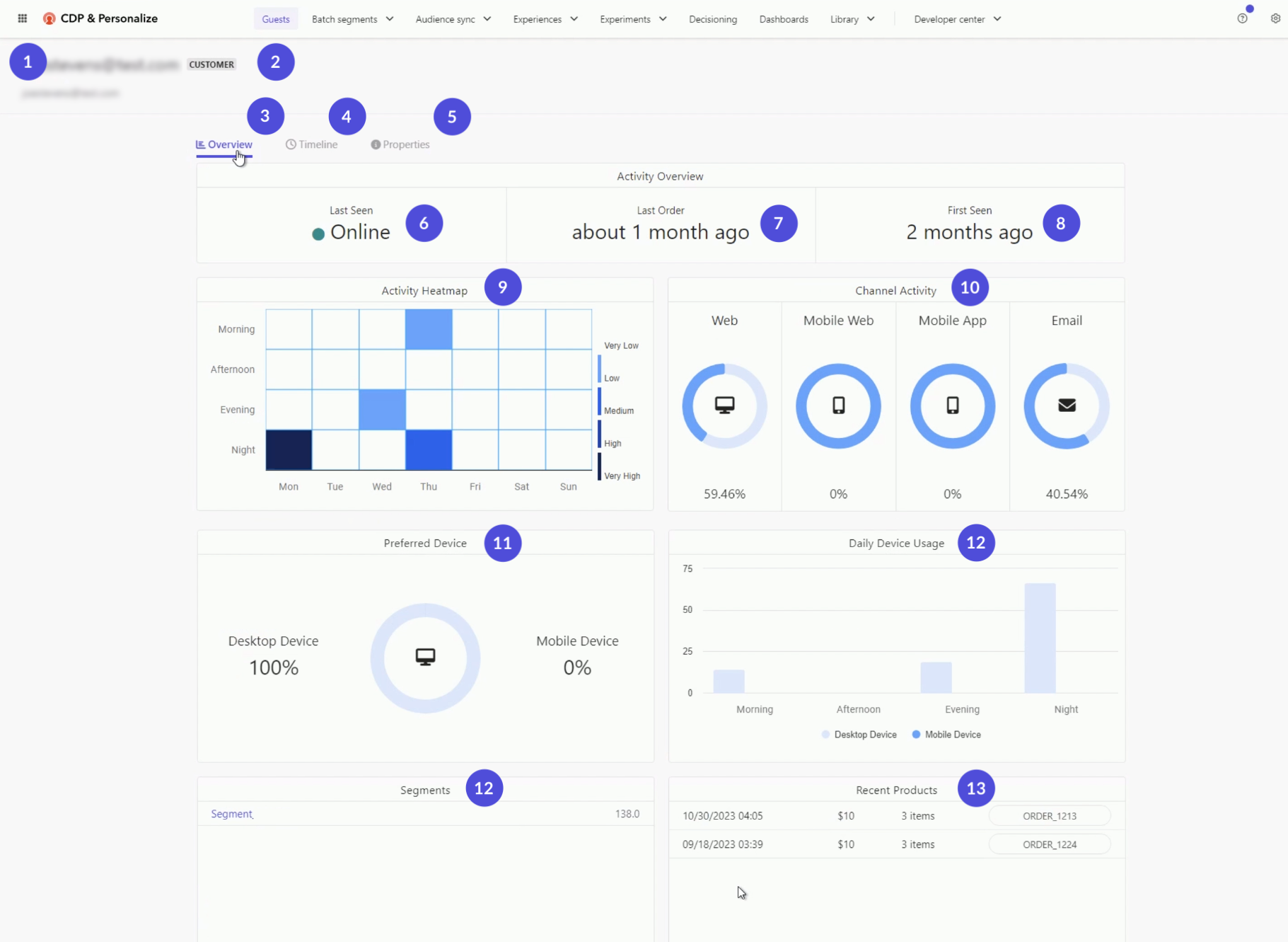 | 3. Overview tab | This is the default tab presenting a comprehensive overview of the guest's interaction data. This includes details of their transactional activities, preferred channels and devices, usage patterns, and the segments they belong to. |